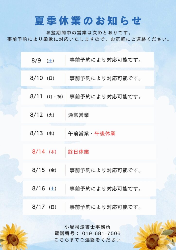 お盆期間中の営業は次のとおりです。事前予約により柔軟に対応いたしますので、お気軽にご連絡ください。